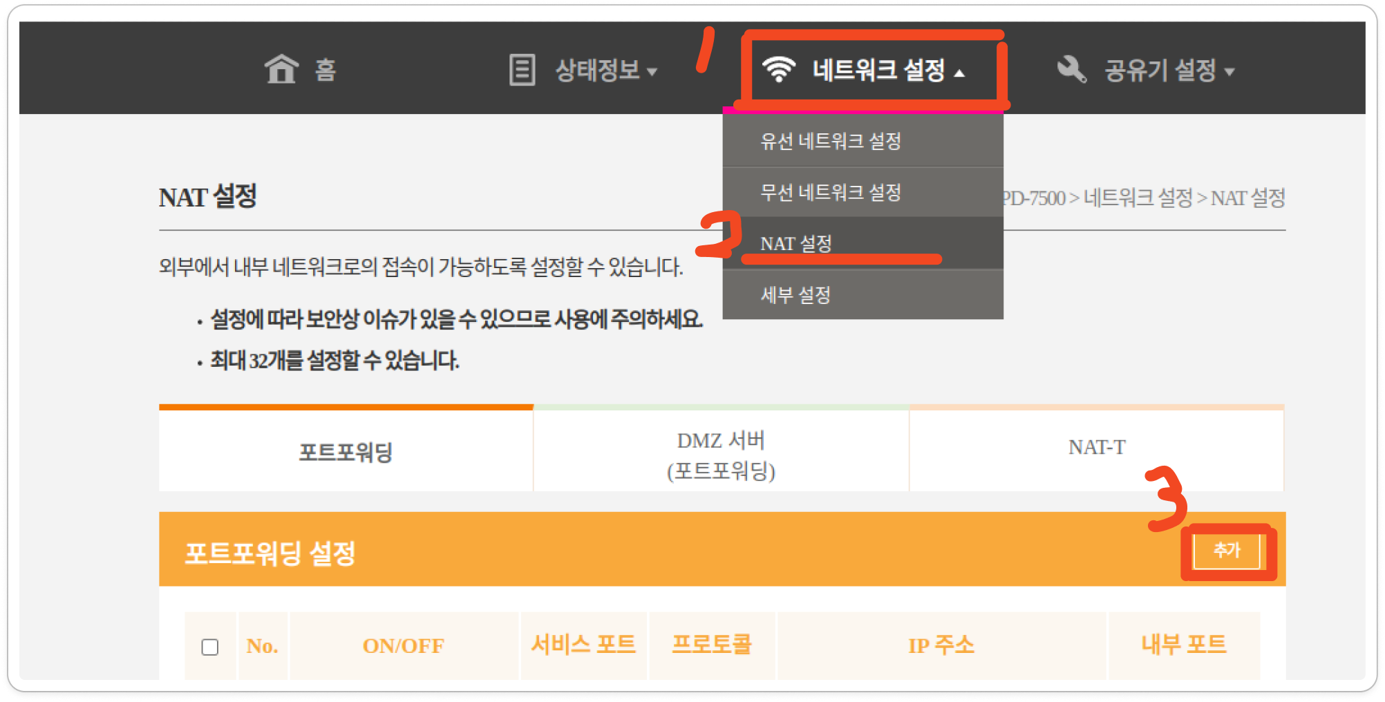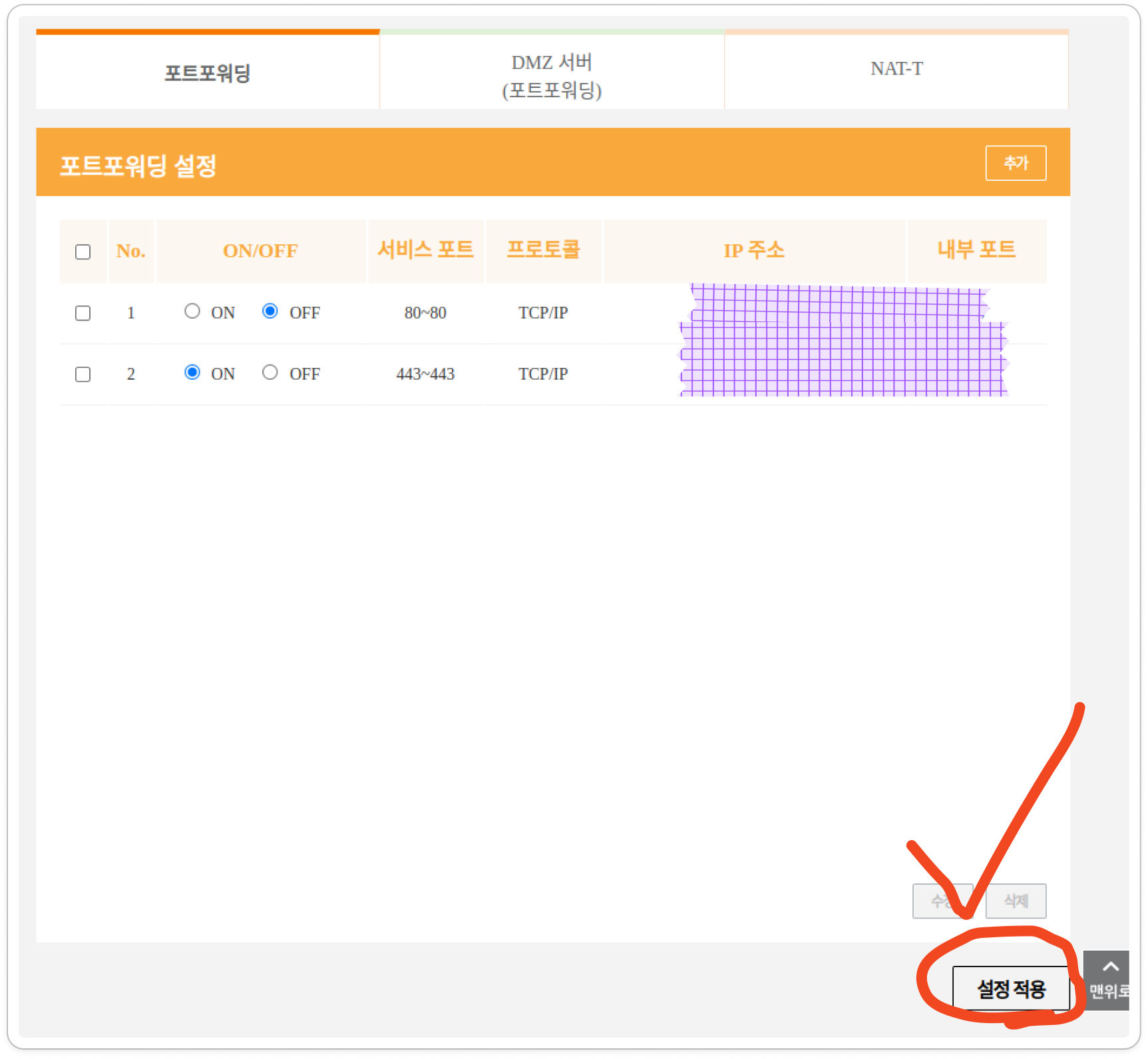 이걸로 내부 IP의 포트포워딩을 할 수 있습니다.