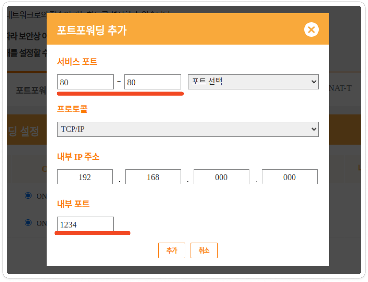 이런식으로 이제 외부IP:80 ---> 내부IP:1234 로 전달해주는 길이 열리게 됩니다.